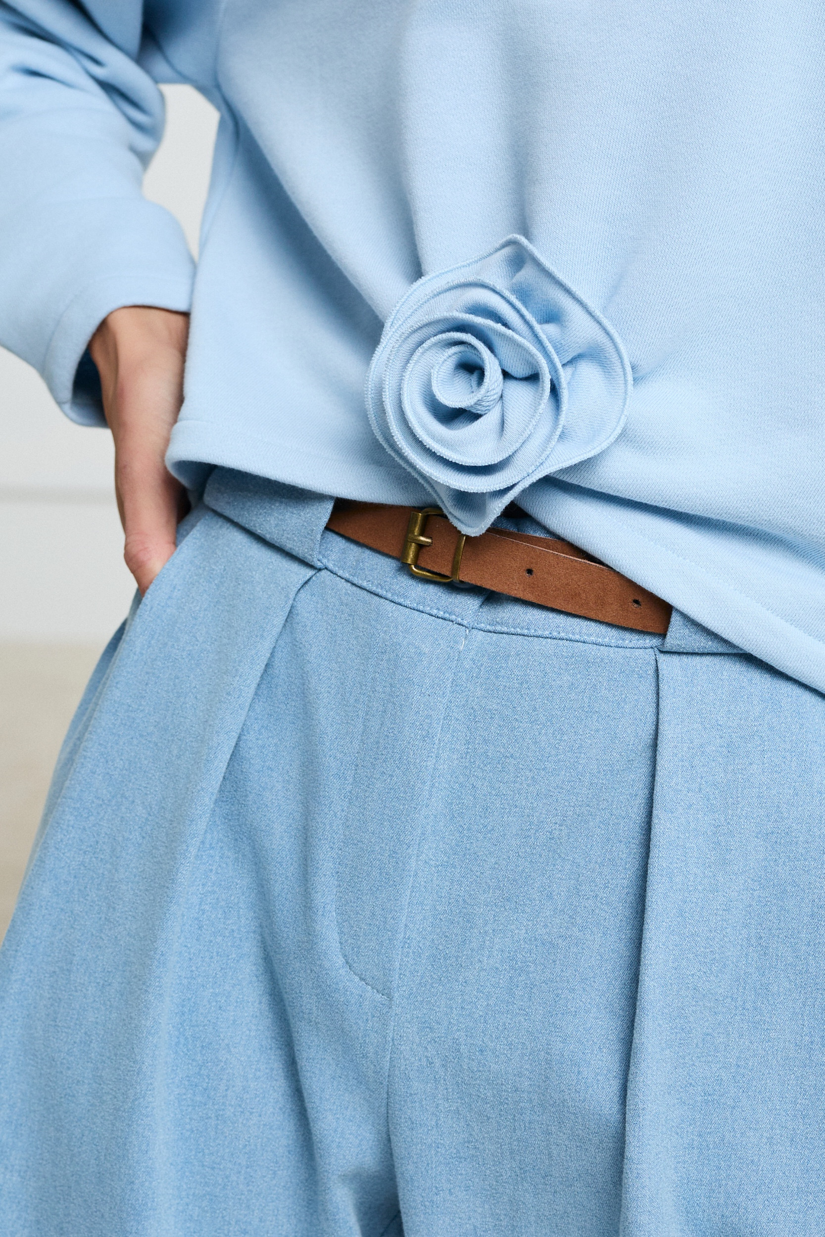 Oversizowa bluza z ozdobnym kwiatem o swobodnym, nowoczesnym kroju. Model wykonany z miękkiej, przyjemnej w dotyku dzianiny, zapewniającej komfort noszenia przez cały dzień. Dekoracyjny kwiat umieszczony z przodu stanowi wyrazisty detal, który nadaje całości kobiecego i modowego charakteru – idealna do casualowych, ale stylowych zestawów.