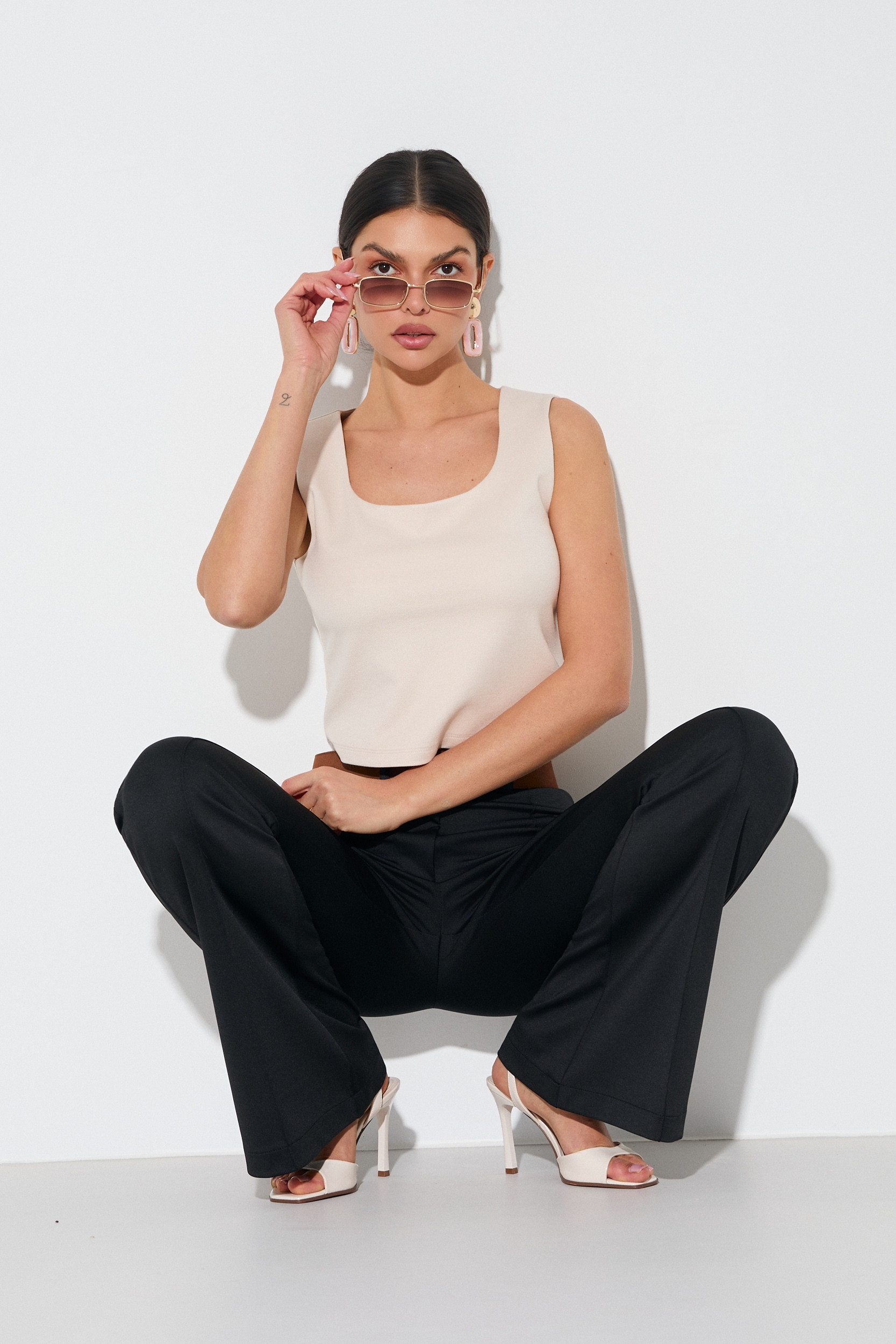 Spodnie o fasonie flare z wysokim stanem, wykonane z gładkiej tkaniny o eleganckim, matowym wykończeniu. Krój charakteryzuje się ścisłym dopasowaniem w biodrach i udach oraz wyraźnie rozszerzaną nogawką od linii kolan, tworzącą dzwonowatą formę. Wzdłuż przodu nogawek zastosowano ozdobne, pionowe przeszycia (front seam), które nadają całości nowoczesnego charakteru, wprowadzają element architektoniczny i optycznie wydłużają sylwetkę. Pas wyposażony w szlufki. Zapięcie na kryty zamek i guzik. Model bez kieszeni, co zapewnia idealnie gładkie ułożenie materiału. Projekt nawiązujący do estetyki lat 70. w minimalistycznym wydaniu.
